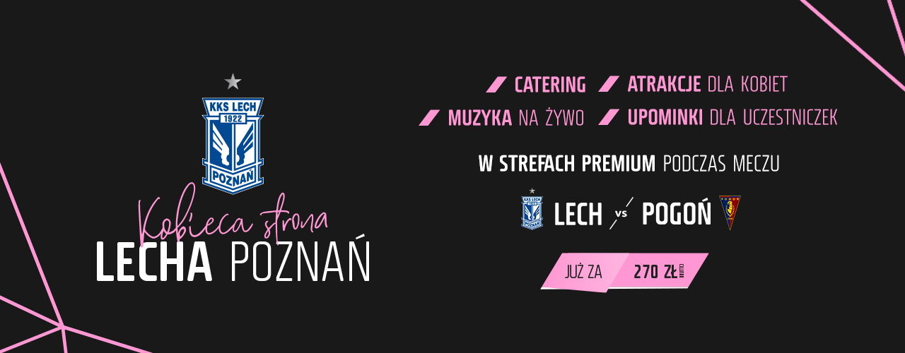 Zapraszamy wszystkie Panie, do wspólnego obejrzenia meczu Lech Poznań - Pogoń Szczecin (04-04-2020, godz. 17:30) w kobiecym gronie w strefie Premium Business Lounge i skorzystania z atrakcji przygotowanych przez partnerów wydarzenia. Kobieca Strona Lecha Poznań to możliwość skorzystania z konsultacji z zakresu zdrowego trybu życia, diety, medycyny estetycznej i mody . Czas umili wykwintny catering przy muzyce na żywo. Każda uczestniczka otrzyma torbę z upominkami od naszych partnerów oraz prestiżową kartę Kobiecej Strony Lecha Poznań dającą liczne przywileje.