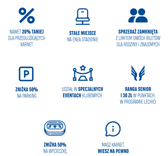 card_giftcardKarnet pełen korzyściKarnet nie tylko się opłaca, ale też gwarantuje szereg innych korzyści! Otrzymujesz 3000 punktów do wykorzystania po pierwszym wejściu na mecz, a także najwyższą rangę w programie LECHICI - Senior, dzięki której masz dostęp do najbardziej ekskluzywnych nagród! Dodatkowo masz gwarantowane miejsce na trybunach, parking 50% taniej, zniżkę na wycieczkę po stadionie oraz klubowym muzeum, pierwszeństwo zakupu biletów na mecze niewchodzące w skład karnetu (spotkania Pucharu Polski), możliwość zmiany miejsca i przekazania biletu, szansę na wzięcie udziału w klubowych wydarzeniach, a także kupisz po dwie wejściówki dla najbliższych w sprzedaży zamkniętej przed każdym meczem.